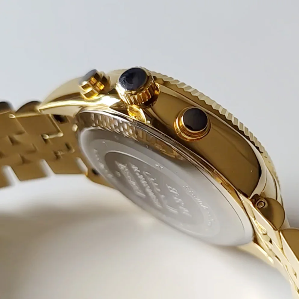 Feature: Alarm, Auto Date, Chronograph, Complete Calendar, Day/Date, Water Resistant